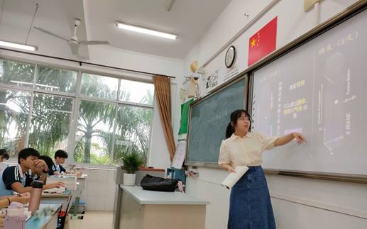 琼山中学给予了实习小组两周的时间去听课。两周后,便有第一次授课的古素凡,由于带班班级不同,课程时间不同,吴雪和吴茵紫也陆续踏上讲台,迎来她们的第一次授课。“台上一分钟,台上十年功”,作为初上讲台的她们,在指导老师的悉心教导下,深刻理解了一节40分钟的课堂,不是拿上课本就上台的即兴演讲,而是需要不断试课、修改教案、打磨课堂而后才能正式授课的课堂,这是对自己、对学生的负责。